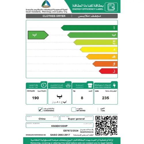 نشافة سوبر جنرال 8 كيلو 16 برنامج – فضي :